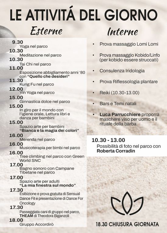 Tra le conferme degli anni passati vi saranno le sessioni di pet therapy a cura di Theodora Biganzoli, le dimostrazioni di arti marziali dolci e il bagno sonoro con le campane tibetane. Per ogni ulteriore informazione si invita a consultare il gruppo Facebook: I commercianti del benessere.