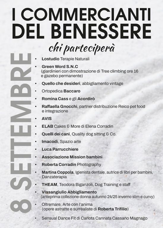 Accanto all’esperta di Lostudio Terapie Naturali ed ai suoi collaboratori, saranno presenti Green Word S.N.C (giardinieri con dimostrazione di Tree climbing), Quello che desideri (boutique di abbigliamento vintage), Ortopedica Baccaro, ELAB Cakes & More di Elena Corradin, Luca parrucchiere, Viasangiulio Abbigliamento, Martina Coppola Igienista dentale (autrice di libri per bambini), Raffaella Gnocchi partner Reico pet food e integrazione e SDF scuola di Sensual Dance Fit di Carlotta Cannata.