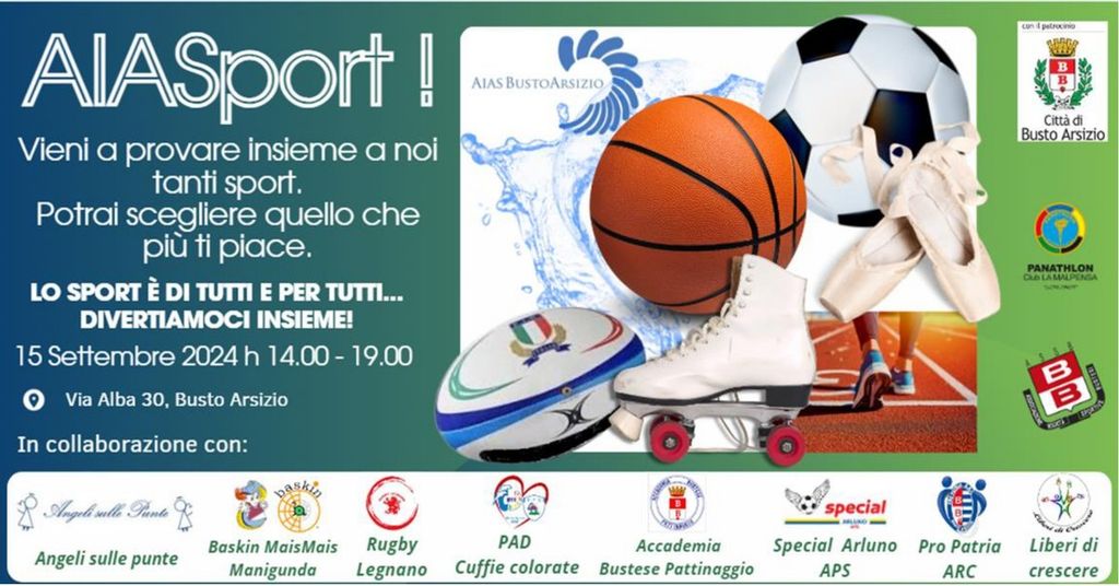 La spinta ad “andare oltre” dello sport trova conferme anche con iniziative successive a quella del 14. Sempre Aias propone “AIASport 2024”: il 15 settembre, dalle 14 alle 19, nella sede di via Alba si terrà una sorta di open day per conoscere, provare, confrontare diverse discipline: calcio, basket e baskin, nuoto, rugby, atletica, danza e pattinaggio. Patrocinano Comune, Panathlon e Assb, collaborano Angeli sulle punte, Baskin Maismais Manigunda, Rugby Legnano, PAD Cuffie colorate, Accademia bustese pattinaggio, Special Arluno Aps, Pro Patria Arc, Liberi di crescere.