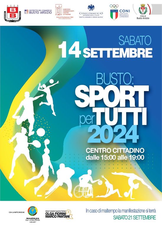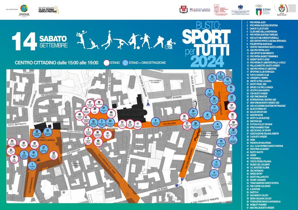“Busto: sport per tutti” torna e punta, ancora di più, su coinvolgimento e inclusione. Saranno oltre 60 le realtà che si metteranno in vetrina, Il 14 settembre (si parte alle 15), nel centro storico della città (vedi elenco completo e mappa in fondo), tra esibizioni, info point e prove pratiche offerte al pubblico. Un mosaico vasto e ricco di sfumature, composto dai giochi di squadra più praticati, da arti marziali, danza, corsa, twirling, scherma, ginnastica, crossfit, shooting, discipline della montagna, boxe, football, padel, tennis, ippica, nuoto, ciclismo...