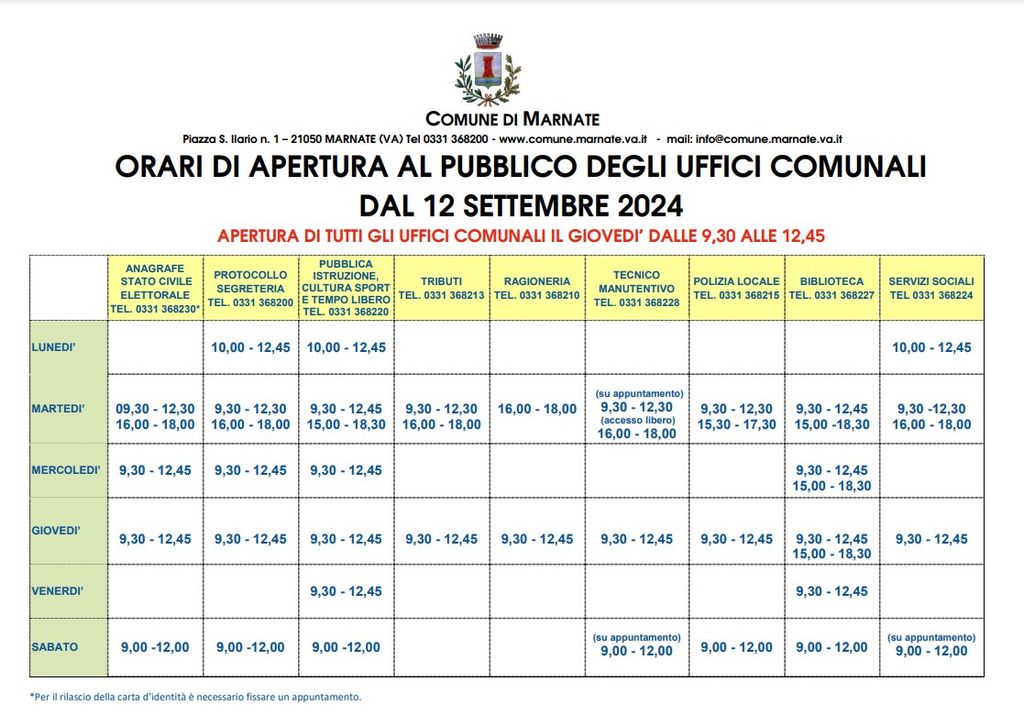 A partire da oggi, giovedì 12 settembre, gli uffici del comune di Marnate avranno dei nuovi orari di apertura al pubblico, studiati appositamente per venire incontro alle esigenze della cittadinanza rendendo più semplice l’accesso da parte del pubblico.