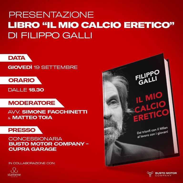Da un’idea del consigliere comunale Alessandro Albani e Matteo Toia, in collaborazione con “Starbene”, giovedì 19 settembre alle ore 18.30 presso la concessionaria Busto Motor Company-Cupra Garage di Busto Arsizio, in via per Fagnano, ci sarà la presentazione del libro “Il mio calcio eretico. Dal trionfi con il Milan al lavoro con i giovani” dell’ex calciatore Filippo Galli.