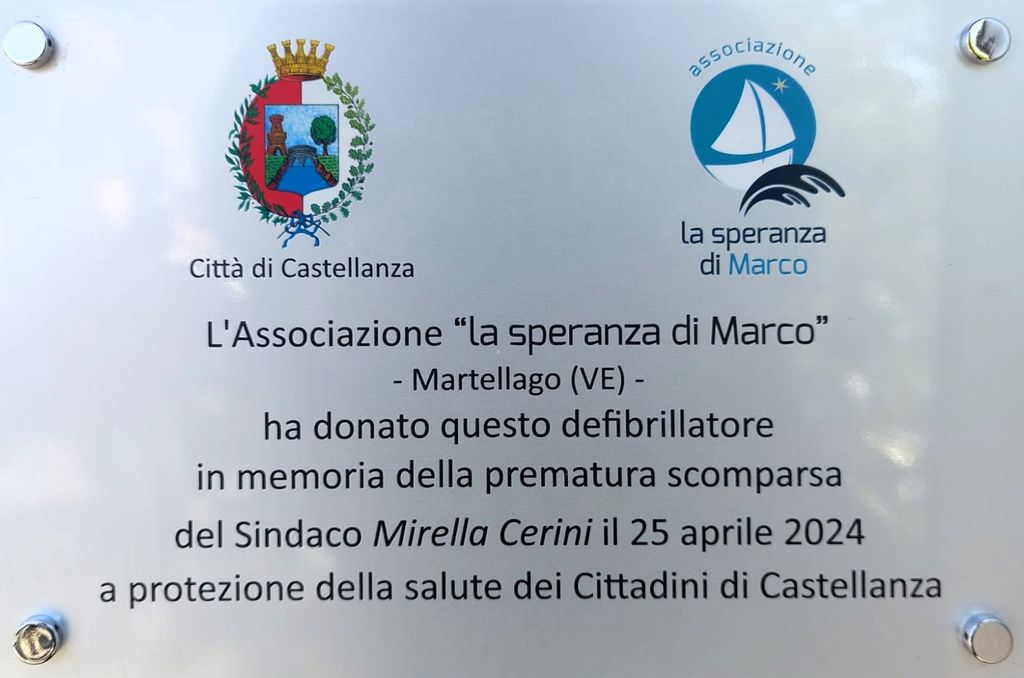 L’ultimo omaggio, poi, è venuto da molto lontano, dal comune di Martellago in Provincia di Venezia; qui ha sede l’associazione la Speranza di Marco, che, nel mese di aprile, dopo aver sentito quanto successo a Castellanza, ha scritto al comune per comunicare la volontà di donare un defibrillatore ai castellanzesi, che è stato posizionato tra l’ingresso della biblioteca e quello della Capannina alla presenza, ancora una volta, dei genitori di Mirella Cerini.