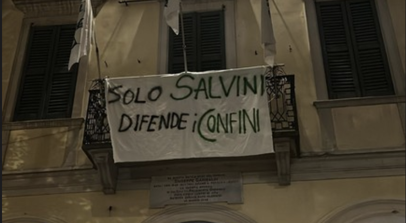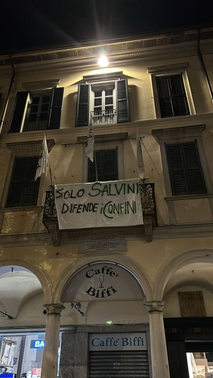 Striscione pro Salvini esposto sul balcone della storica sede della Lega di piazza del Podestà a Varese. E' comparso nelle scorse per opera dai militanti della Lega Giovani del Varesotto «a sostegno del Vicepremier e Ministro delle Infrastrutture Matteo Salvini» con la scritta "Solo Salvini difende i confini".