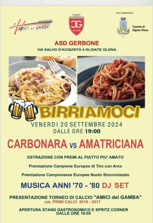 A dare il via al weekend venerdì 20 settembre sarà Birriamoci, una serata di svago e divertimento caratterizzata da una sfida speciale: “carbonara vs amatriciana”; le cucine cha apriranno alle 19, infatti, offriranno, tra gli altri, la possibilità di scegliere tra i due celebri primi piatti tipici della cucina romana e, chiunque deciderà di acquistarli, riceverà un numero da conservare sino a dopo cena.