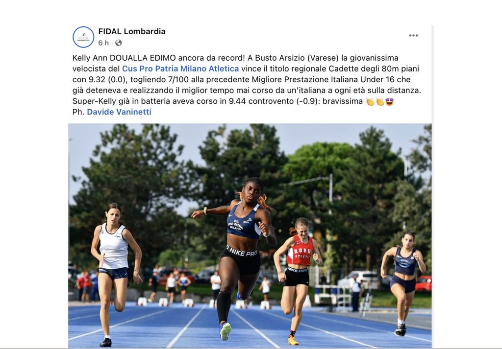 L'ha celebrata anche la Fidal: «Ann DOUALLA EDIMO ancora da record! A Busto Arsizio la giovanissima velocista del Cus Pro Patria Milano Atletica vince il titolo regionale Cadette degli 80m piani con 9.32 (0.0), togliendo 7/100 alla precedente Migliore Prestazione Italiana Under 16 che già deteneva e realizzando il miglior tempo mai corso da un'italiana a ogni età sulla distanza. Super-Kelly già in batteria aveva corso in 9.44 controvento (-0.9): bravissima».