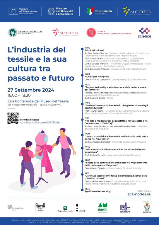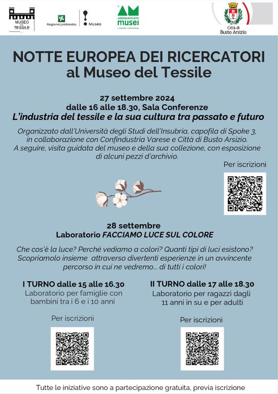 Venerdì 27 settembre dalle ore 16.00 alle 18.30 la sala conferenze del museo ospiterà il convegno “L’industria del tessile e la sua cultura tra passato e futuro”, organizzato dall’Università degli Studi dell’Insubria, capofila di Spoke 3, in collaborazione con Confindustria Varese e Città di Busto Arsizio, Assessorato a Cultura, Identità e Sviluppo Economico.