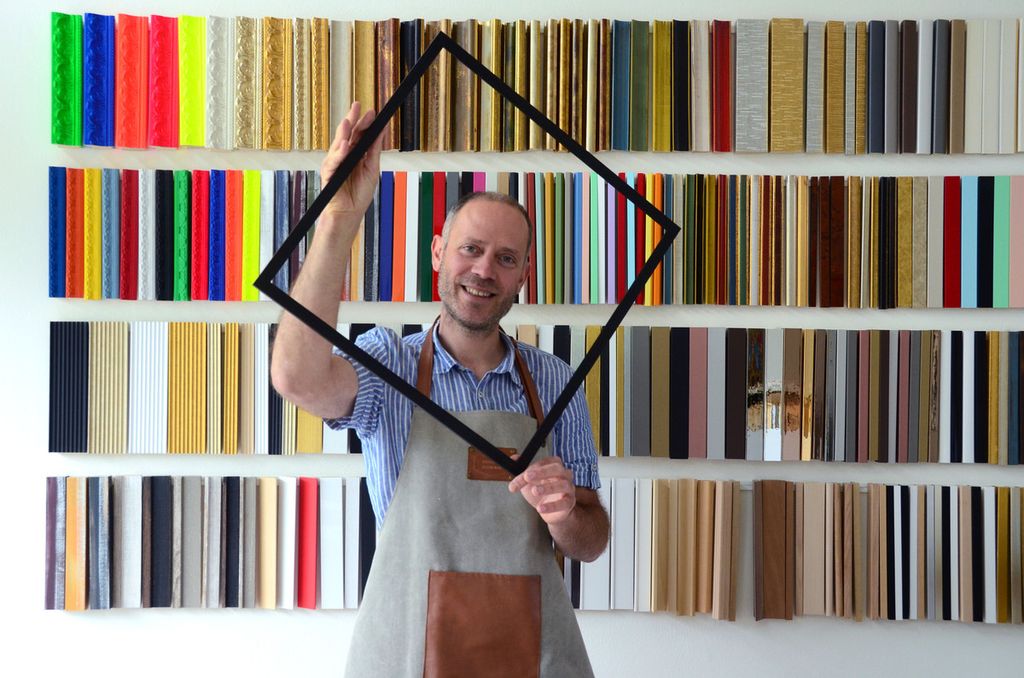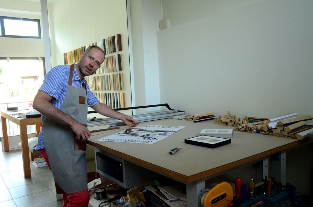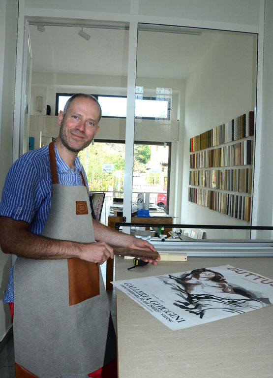 Alberto Leoni, 48 anni, corniciaio varesino nel suo "Cornici da Leoni" ad Avigno