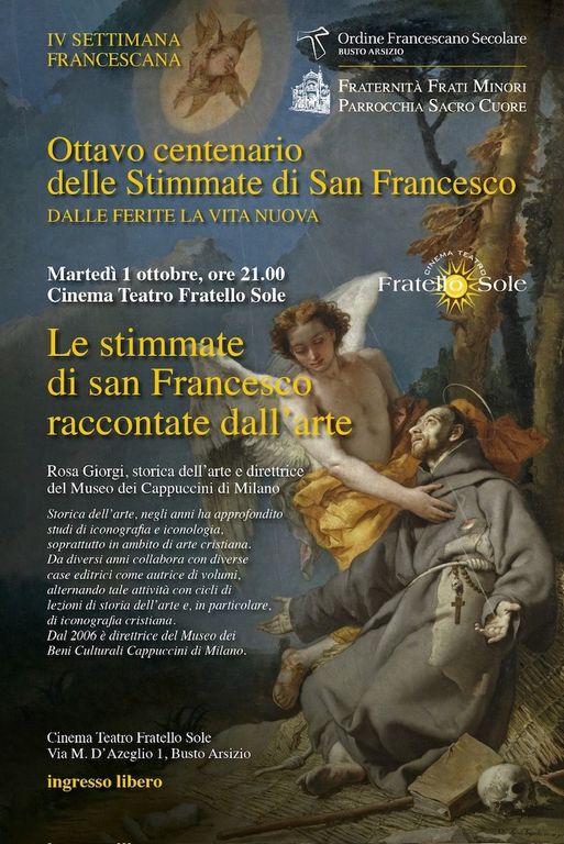 Le stimmate, una delle manifestazioni che più colpiscono immaginario e sensibilità dei cristiani nel ripercorrere l’esperienza di San Francesco. E che ricorrono frequentemente nella rappresentazione del poverello d’Assisi, a partire dagli affreschi che, nella Basilica Superiore della città umbra, costituiscono un inestimabile patrimonio storico, artistico, culturale e di fede. A 800 anni dal dono doloroso che suggella l’unione di Francesco con Gesù (la data precisa è il 17 settembre 1224) la parrocchia del Sacro Cuore organizza l’incontro “Le stimmate di San Francesco raccontate dall’arte” (locandina in fondo). Interviene la storica dell’arte e direttrice del Museo dei Cappuccini di Milano, Rosa Giorgi, esperta, fra l’altro, di iconografia e iconologia. Autrice di numerosi volumi per diverse case editrici, tiene regolarmente cicli di lezioni di storia dell’arte e di inconografia cristiana. Appuntamento al Cinema Teatro Fratello Sole martedì 1 ottobre, alle 21. Ingresso libero.