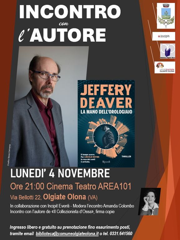 Così lunedì 4 novembre alle ore 21, il Cinema Teatro AREA101 grazie alla Biblioteca di Olgiate Olona ospiterà Jeffery Deaver. L’evento, realizzato in collaborazione con Incipit Eventi, vedrà la presentazione del suo ultimo libro La mano dell'orologiaio.