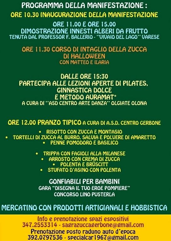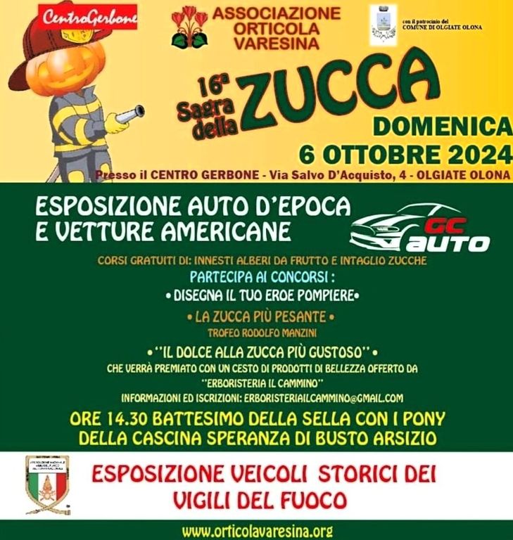 Anche quest’anno con l’arrivo della prima domenica di ottobre il Centro Gerbone di Olgiate Olona si colorerà di arancione grazie alla Sagra della Zucca, lo storico appuntamento organizzato in collaborazione con l’associazione Orticola Varesina, che quest’anno è giunto alla sua 16ª edizione.
