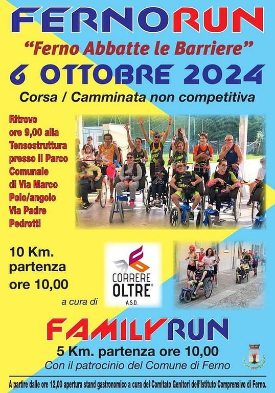 Seconda edizione della FernoRun "Ferno abbatte le barriere" in programma per domenica 6 ottobre, a partire dalle 10, con punto di ritrovo e partenza presso il parco di via Marco Polo (locandina completa in fondo). Il percorso della gara (non competitiva, ma ispirata ai valori della inclusività, accessibilità e beneficenza) si snoderà su due percorsi, uno lungo 10 km e l'altro, la Family Run, lungo 5 chilometri.