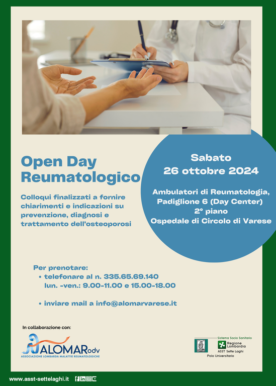Sabato 26 ottobre ci sarà l'Open Day Reumatologico. L'ASST Sette Laghi, in collaborazione con Alomar Odv, organizza un Open Day Reumatologico dedicato a colloqui finalizzati a fornire chiarimenti e indicazioni su prevenzione, diagnosi e trattamento dell'osteoporosi.