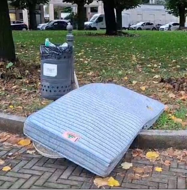 Resistono lì. Non lontano ci sono panchine disastrate e inutili, trasferite tempo fa dal centro cittadino (sotto di esse si accumula sporcizia di vario genere) e un’area verde dalla quale affiorano una ruota di bicicletta (anche questa raminga, nell’arco di almeno un mese è stata appoggiata a diversi cestini della spazzatura fino a trovare riparo sotto a un albero), qualche rimasuglio vegetale dovuto a sfalcio, un paio di rami di diverso calibro. Ma, di nuovo con Renzo Arbore, il materasso è di più, «…il materasso è il massimo che c'è».