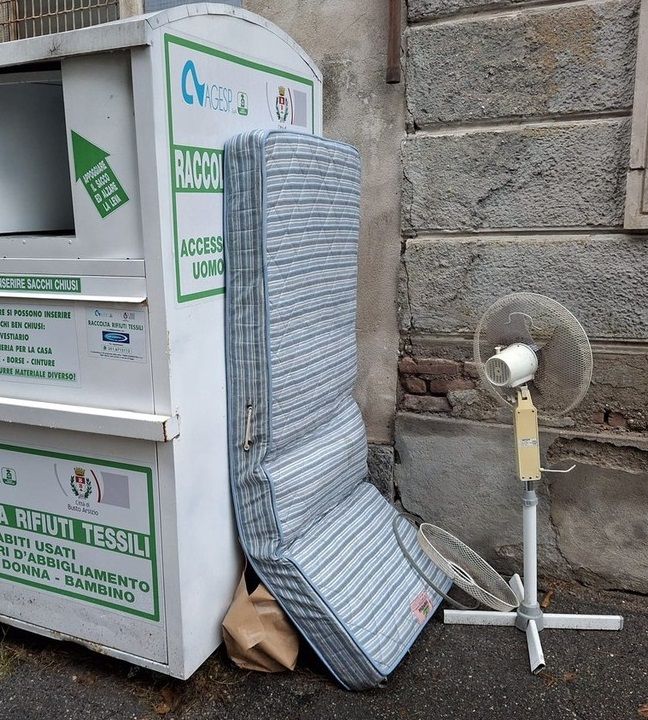 Il materasso è la felicità, cantava Renzo Arbore. Difficile, però, che quanti vivono e lavorano in piazza XXV Aprile, o dintorni, pensino la stessa cosa, almeno quando posano lo sguardo sull’area prospiciente la vecchia caserma dei Carabinieri. Da oltre una settimana, è arredata con un materasso, abbandonato da qualche incivile vicino al contenitore Agesp per rifiuti tessili (ce ne eravamo occupati una prima volta, dopo qualche giorno di permanenza, QUI, foto anche in fondo). Oggi il materasso è ancora in piazza, insieme all’accessorio che l’ha accompagnato fin dal primo momento: un ventilatore rotto.