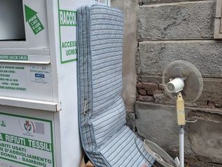 Il materasso è la felicità, cantava Renzo Arbore. Difficile, però, che quanti vivono e lavorano in piazza XXV Aprile, o dintorni, pensino la stessa cosa, almeno quando posano lo sguardo sull’area prospiciente la vecchia caserma dei Carabinieri. Da oltre una settimana, è arredata con un materasso, abbandonato da qualche incivile vicino al contenitore Agesp per rifiuti tessili (ce ne eravamo occupati una prima volta, dopo qualche giorno di permanenza, QUI, foto anche in fondo). Oggi il materasso è ancora in piazza, insieme all’accessorio che l’ha accompagnato fin dal primo momento: un ventilatore rotto.