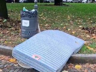 Qualcuno, probabilmente nella speranza di una rimozione, ha spostato entrambi vicino a un cestino della spazzatura. Hanno preso pioggia per un po’, poi sono stati di nuovo trasferiti nella collocazione originaria, il materasso un po’ più umido e flaccido.