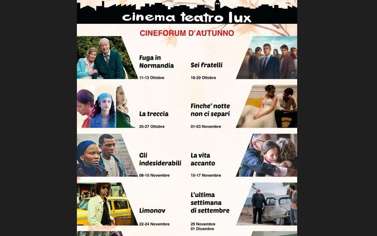 Una rassegna che racconta storie di vita e di lotta, di uomini e donne alle prese con sfide personali, familiari e sociali, racconti che spaziano dall'avventura all'introspezione, dalla commedia al dramma sociale. Questo il focus del Cineforum d'autunno al Cinema Teatro Lux in programma dall’11 ottobre al 15 dicembre, ogni venerdì e domenica, (ore 16 e 21). Ingresso singolo a 5 euro o abbonamento per dieci film a 30 euro (ridotto 25 euro per studenti e over 65).
