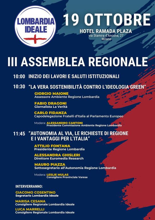Sabato 19 ottobre, dalle 10 alle 13, presso l’Hotel Ramada Plaza, in via Stamira d’Ancona 27 a Milano, si terrà la terza Assemblea regionale di Lombardia Ideale, movimento civico che in Regione, nei Comuni e nelle Province lombarde esprime oltre 300 amministratori locali.
