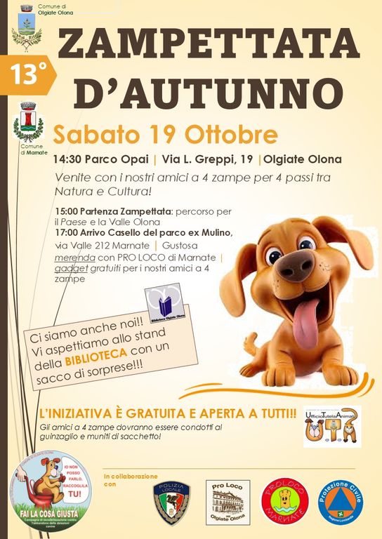 Le amministrazioni comunali di Olgiate Olona e Marnate, con il prezioso contributo di numerose associazioni locali, organizzano la 13ª edizione della “Zampettata d’Autunno”, un evento speciale dedicato ai nostri amici a quattro zampe, sempre pronti a regalare affetto e avventure assieme.