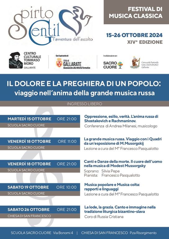 Approfondimenti, ascolti, concerti: “Spirto gentil”, il festival di musica classica, organizzato dal Centro Culturale Tommaso Moro, conferma la sua formula, anche coinvolgendo le scuole, e lancia una grande sfida culturale. Quella di affrontare una tradizione profonda e stratificata, intrecciata a vicende storiche, spiritualità, fede: “Il dolore e la preghiera di un popolo: viaggio nell’anima della grande musica russa” è il titolo della 14esima edizione (volantino nel file in fondo).