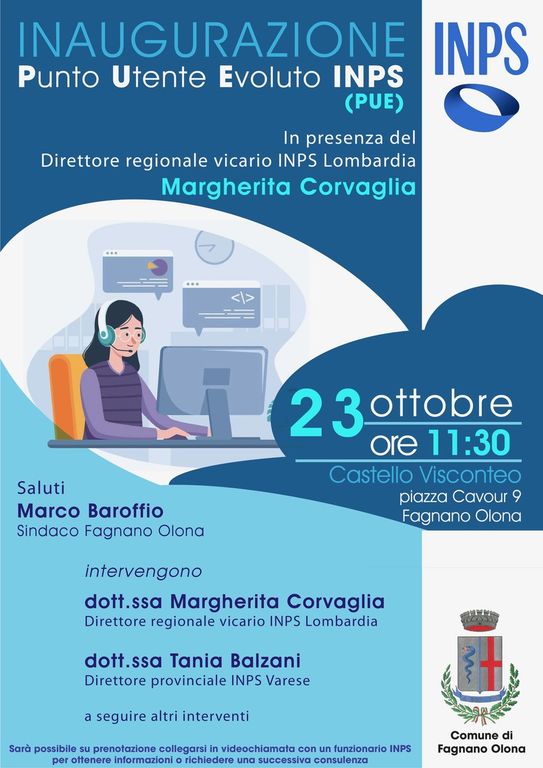 Un nuovo punto di riferimento per assicurare ai cittadini la più ampia accessibilità ai servizi forniti dall'Inps valorizzando la sinergia con la Pubblica Amministrazione. È questo l’obiettivo del PUE “Punto Utente Evoluto”, il primo in Lombardia, che da mercoledì 23 ottobre aprirà i battenti presso la sede municipale del Castello Visconteo di piazza Cavour 9.