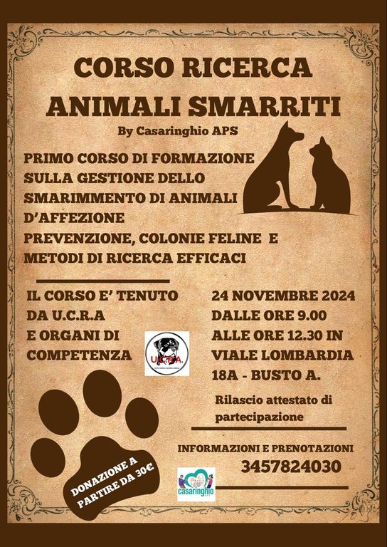 Casaringhio Aps propone il primo corso di formazione, nell’Alto Milanese, con lo scopo di dare nozioni concrete per creare una squadra di ricerca sul territorio nel caso, non raro, di smarrimento di animali d’affezione.