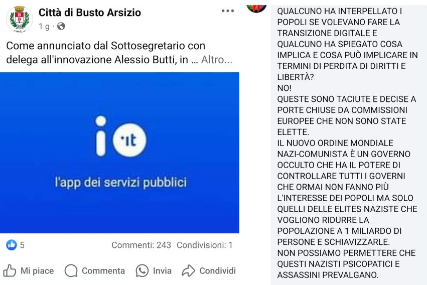 Questa volta, invece, nel messaggio si legge: «Qualcuno ha interpellato i popoli se volevano fare la transizione digitale e qualcuno ha spiegato cosa implica e cosa può implicare in termini di perdita di diritti e libertà? No! Queste sono taciute e decise a porte chiuse da commissioni europee che non sono state elette». E poi prosegue a suon di «nuovo ordine mondiale nazi-comunista» ed «élites naziste che vogliono ridurre la popolazione a 1 miliardo di persone e schiavizzarle».