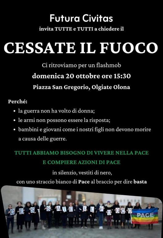 Ancora una volta il gruppo Futura Civitas scende in piazza per la Pace, e lo farà domenica 20 ottobre alle 15.30 in piazza San Gregorio a Olgiate Olona, con un breve momento di flash mob per chiedere a gran voce il cessate il fuoco nella guerra in Medio Oriente.
