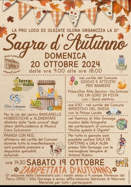 Anche quest’anno la terza settimana di ottobre torna l’appuntendo con la Sagra d’Autunno olgiatese, la manifestazione organizzata dalla Pro Loco che per il 21 anno animerà le vie del centro cittadino con una serie di attrazioni ed eventi dedicati a grandi e piccini.