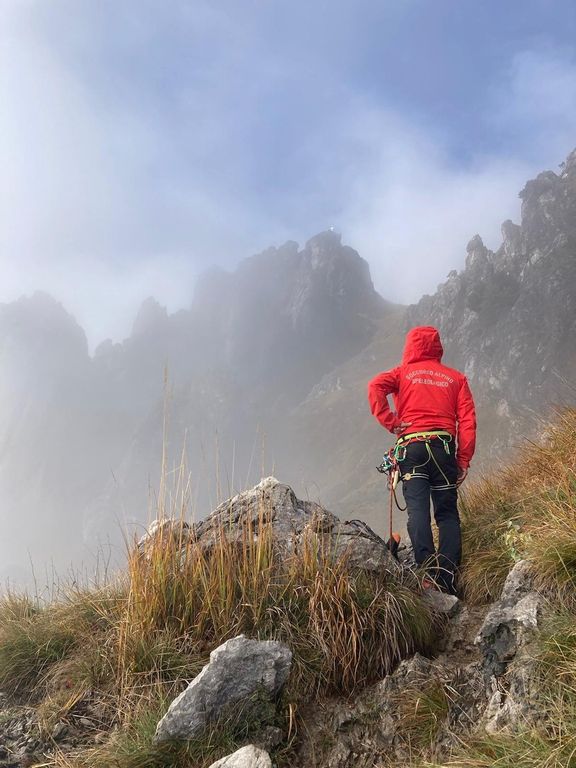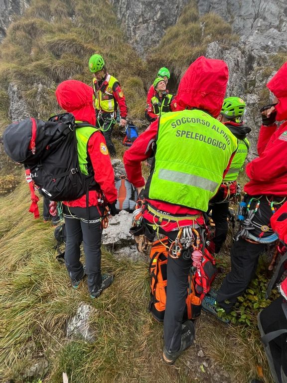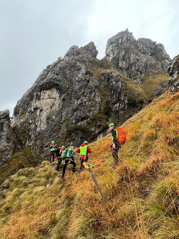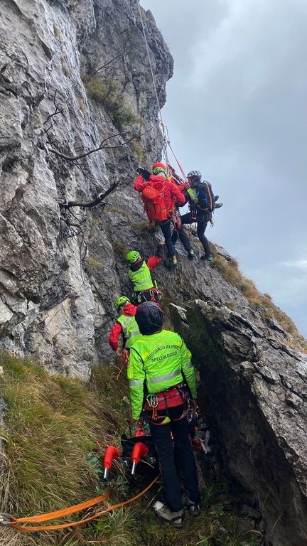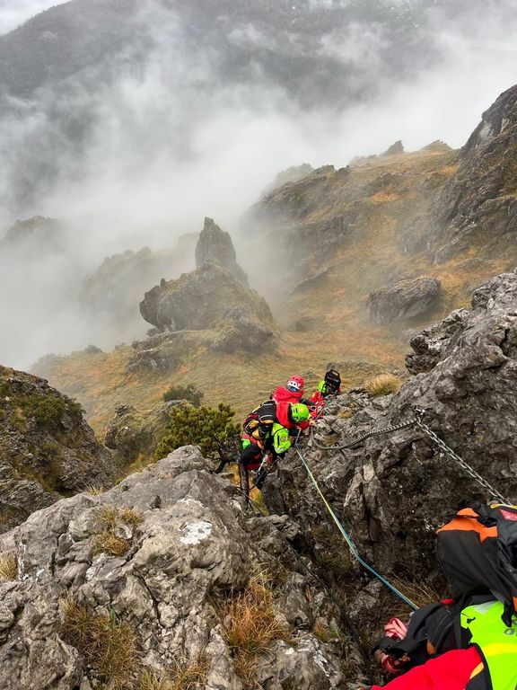 Gli operatori hanno poi effettuato il recupero, sempre in ferrata, eseguito le procedure di condizionamento con il Next (un particolare tipo di immobilizzatore che si utilizza in contesti particolari e che consente un notevole risparmio di tempo). È seguita la calata della persona infortunata, che è poi stata imbarellata e infine stata trasportata per un tratto con la barella portantina.