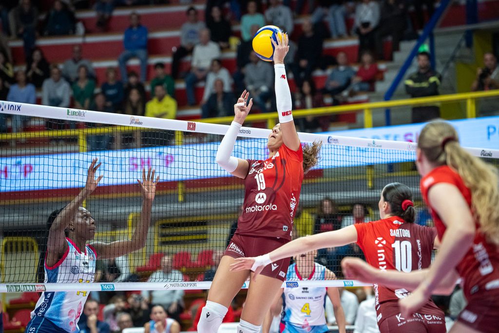 Nel secondo set c’è equilibrio fino al 10, poi Obossa (6 punti nel parziale) e Sartori fanno faville ed accelerano fino al 14-10, con Pelloni super in difesa. Le ospiti non ci stanno e rialzano la testa, con Antropova (7 nel game) sugli scudi (14-15), si gioca testa a testa fino al 23 (bene Obossa con 6 punti), poi super Carol chiude i conti con una doppietta (23-25).