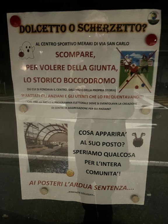 Ora, “Qui per Esserci”, va (ancora) all'attacco di Scazzosi & Co. «Al centro sportivo Meraki di via San Carlo scompare per volere della giunta lo storico bocciodromo, su cui si fondava il centro dall'inizio della propria storia – si legge nel volantino – Sfrattati gli anziani e gli utenti che lo frequentavano. Che fine ha fatto il programma elettorale dove si sventolava la creazione di centri di aggregazione per gli anziani? Cosa apparirà al suo posto? Speriamo qualcosa per l'intera comunità. Ai posteri l'ardua sentenza» è la chiosa del volantino. Un altro attacco, diretto, di “Galli e compagnia” all'amministrazione comunale e al gruppo del primo cittadino Marco Scazzosi, frutto di una campagna elettorale e di un voto amministrativo che ha lasciato in eredità pesanti divisioni e diversità di vedute, su più fronti.