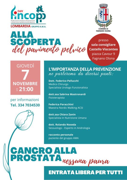“Prevenzione” è la parola d’ordine alla base di un incontro che promette di affrontare diversi argomenti, in primis quello degli stili di vita che rendono meno probabile l’insorgere di tumori (la locandina dell'evento, nel file sottostante, riporta lo slogan "Cancro alla prostata - Nessuna paura") e di altre patologie. Interverranno Federico Pellucchi, urologo funzionalista, Sabrina Mastronardi, fisioterapista, Federica Paracchini, maestra di Nordic walking Acsi, Chiara Zanin, specialista della nutrizione, Rolando Noseda, sessuologo esperto di andrologia. Porterà la sua esperienza personale un paziente Fincopp Lombardia – Gruppo A.M.A. L’ingresso è gratuito.