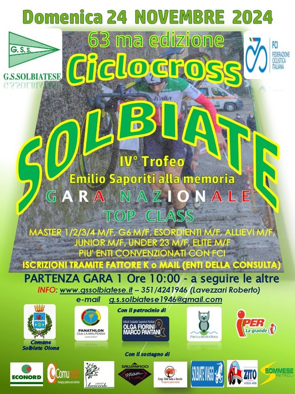Domenica 24 novembre il 63° Ciclocross di Solbiate, tradizionale gara del calendario Nazionale F.C.I. Ciclocross. La competizione, organizzata dal G.S. Solbiatese, è salita di livello ritornando dopo anni nel calendario nazionale; un traguardo importante per la società, ma anche una grande responsabilità, affrontata come sempre con serietà e con il massimo impegno.