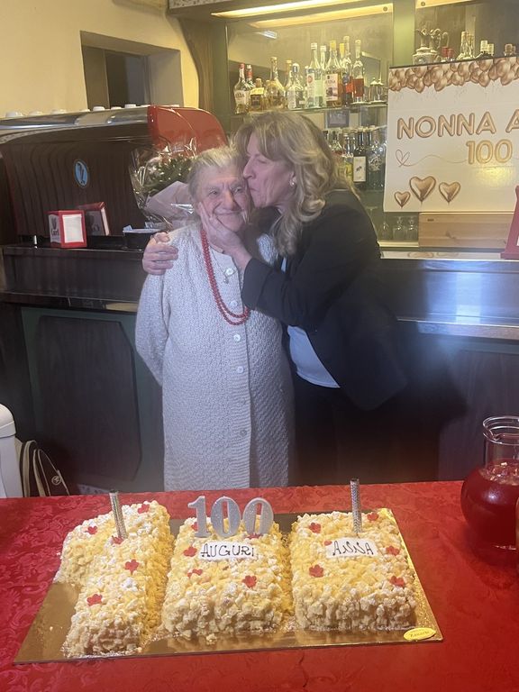 Anna Possi, travolta dalla festa e dall'affetto dei suoi cari, al centesimo compleanno. Quello che aggiunge ulteriore luce al titolo di barista più longeva d'Italia, nonché commendatore da poche ore (LEGGI QUI).