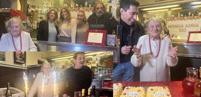 Anna Possi, travolta dalla festa e dall'affetto dei suoi cari, al centesimo compleanno. Quello che aggiunge ulteriore luce al titolo di barista più longeva d'Italia, nonché commendatore da poche ore (LEGGI QUI).