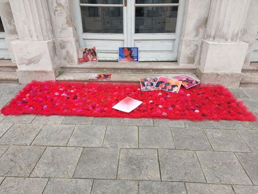 Sul tappeto, che racchiude in sé numerose sfumature di rosso, sono posizionati anche diversi cartelli sui quali sono riportate le parole con cui le donne che vivono il nostro territorio hanno raccontato le loro esperienze e uno scritto che riassume il messaggio che riassume il significato di questo giorno.