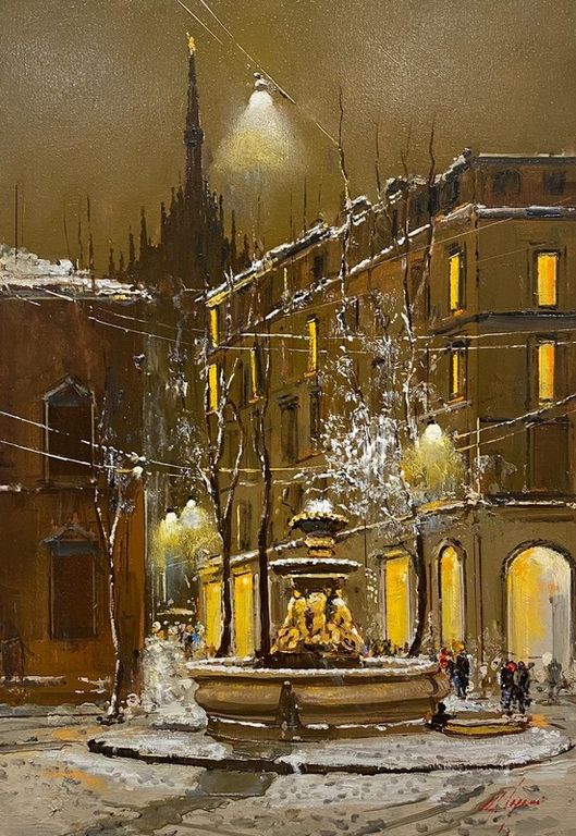 Questo è il periodo dell' anno in cui a Milano tutto viene avvolto da magiche atmosfere, complici la nebbia o la neve, che Laganà ben esalta nei suoi dipinti. La settimana del Santo Patrono e della prima della Scala viene attesa, proprio perché rappresenta quell'istante rigenerante e fiabesco che ogni milanese che è stato bambino e lo è ancora nel cuore conserva ben impresso nella memoria: i profumi gourmand della "gnaccia" al carretto vicino al Duomo o delle dolci ghirlande di marroni agli Oh Bej Oh Bej, tappa imperdibile di un itinerario che resta indelebile nella mente, quella fragranza squisita delle prime fette di panettone e dei gustosi ravioli in brodo della tradizione che si uniscono all' incanto delle luci del centro, delle vetrine sfolgoranti dei luoghi simbolo della milanesità predisposti per donare al cuore la pace amorevole e spirituale.