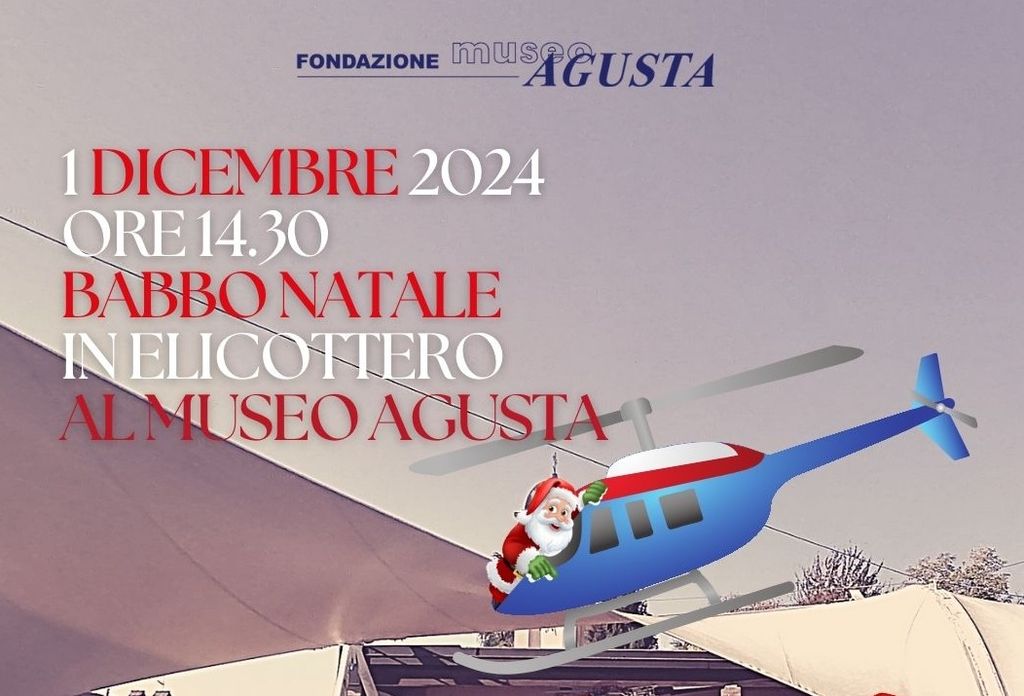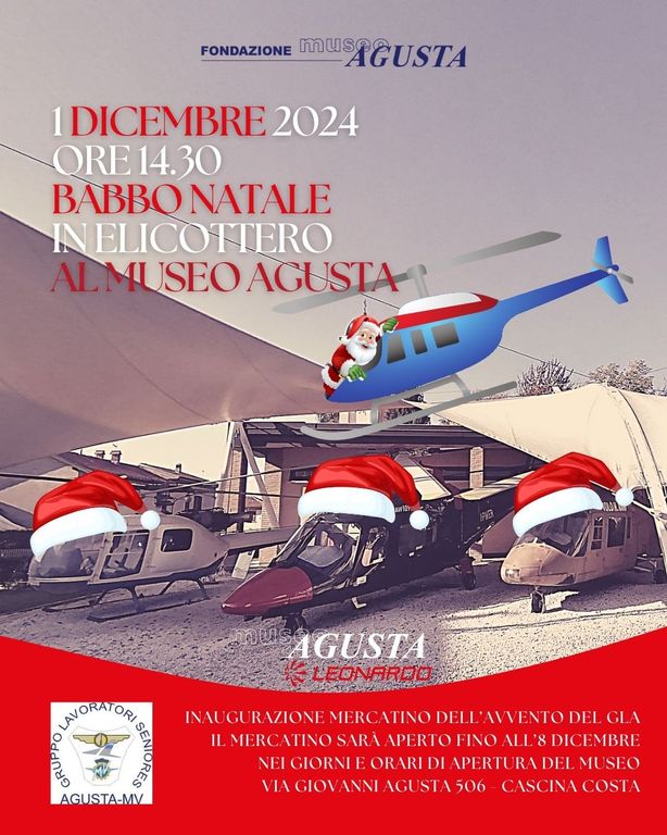 Domenica 1 dicembre 2024, il cielo sopra il Museo Agusta sarà teatro di uno spettacolo unico e indimenticabile: l’arrivo di Babbo Natale in elicottero. A partire dalle ore 14:30, grandi e piccini potranno assistere a questo evento speciale, che unisce tradizione natalizia e passione per il volo (locandina completa in fondo).