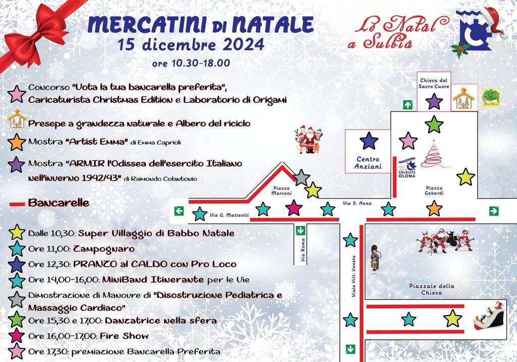 È già scattato il conto alla rovescia, perché i preparativi sono tanti in vista dei mercatini (un'ottantina le bancarelle) di domenica 15 dicembre nel centro del paese. "𝐋'𝐄́ 𝐍𝐀𝐓𝐀𝐋 𝐀 𝐒𝐔𝐋𝐁𝐈𝐀" è la decima edizione dell'evento tra colori, luci, bancarelle, personaggi, animazioni continue per tutta la giornata, musica.