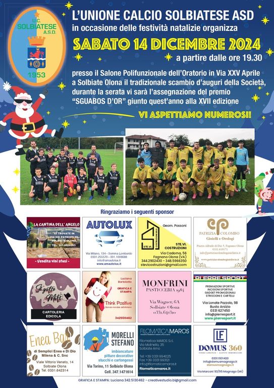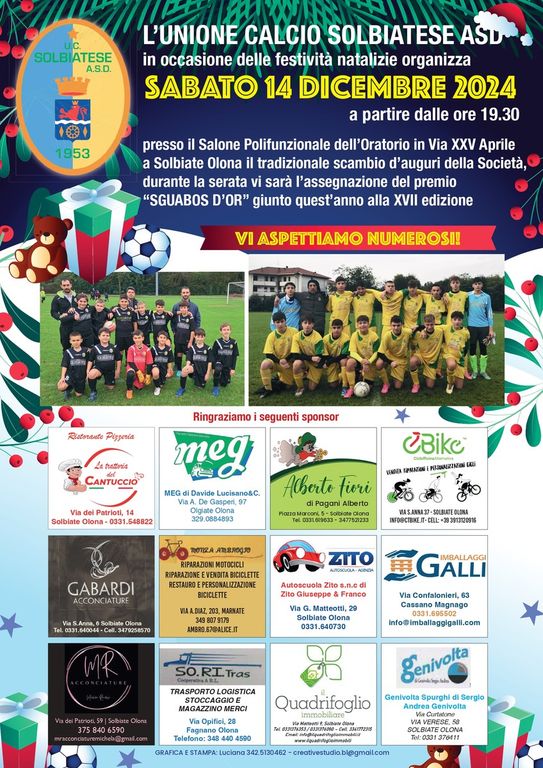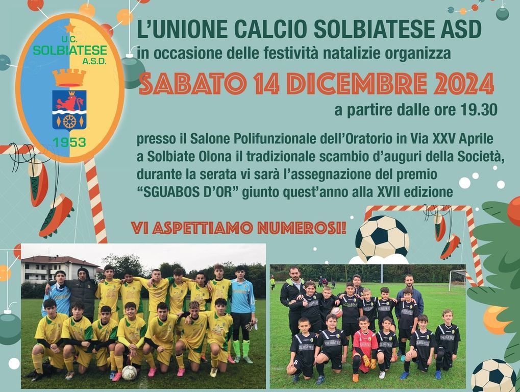Duecentotrenta tesserati più allenatori e dirigenti. E poi il diciassettesimo Sguabass d'or assegnato a una personalità di spicco che in questi anni ha fatto qualcosa di importante all'interno della società: l'Unione Calcio Solbiatese si è data appuntamento all'interno del salone polifunzionale dell'oratorio di via XXV aprile per una grande festa in vista del Natale.