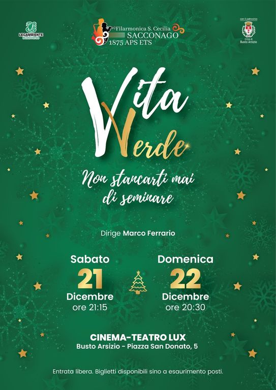 “Vita Verde, non stancarti mai di seminare”, questo il titolo del prossimo spettacolo di Natale della Filarmonica Santa Cecilia di Sacconago, in programma sabato 21 (alle 21.15) e domenica 22 dicembre (alle 20.30) al Teatro Lux di Sacconago.