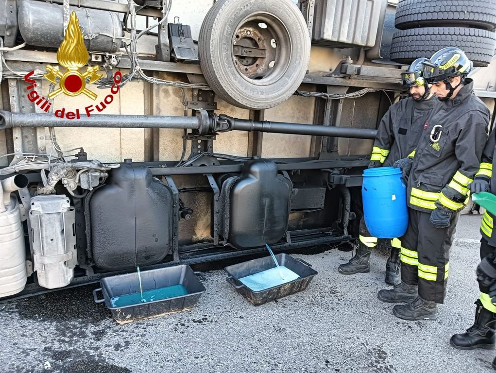 FOTO. Camion si ribalta in curva a Cislago: sversati 200 litri di gasolio sulla strada