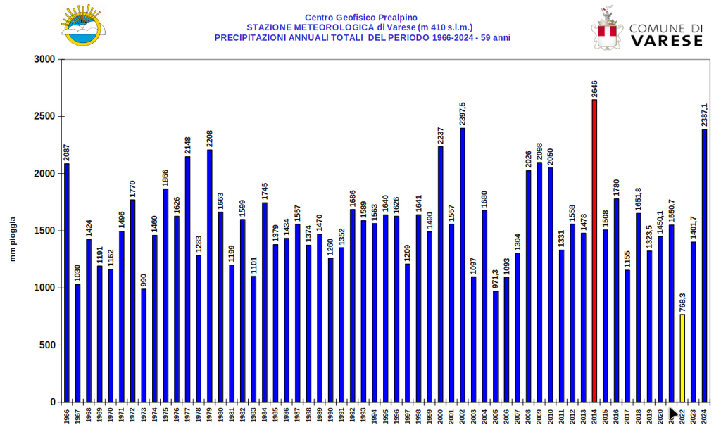 La pioggia accumulata nel corso dell’anno è stata di 2387 mm, al terzo posto degli anni più piovosi dal 1965 dopo il 2014 (2646 mm) e il 2002 (2397,5 mm). Con un eccesso di 830 mm si può considerare colmato il deficit di 763 mm cumulato nel 2022.