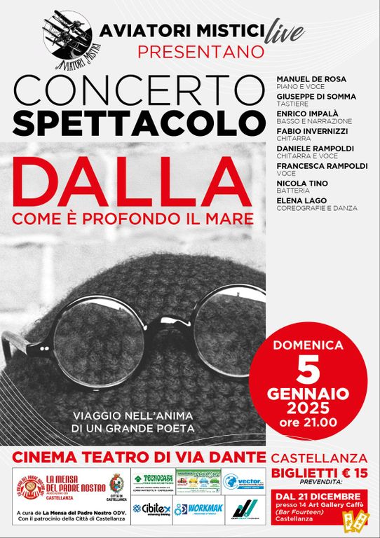 La Mensa del Padre Nostro, con il patrocinio della Città di Castellanza, organizza per domenica 5 gennaio alle ore 21 il Teatro di Via Dante il Concerto Spettacolo “Dalla – Come è profondo il mare”.