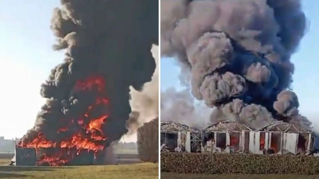 La maxi colonna di fumo che saliva nel cielo azzurro è stato il primo elemento visibile ma poi è arrivato il rosso delle fiamme che a poco a poco hanno avvolto l’hangar divorando e lanciando solo uno scheletro nero.