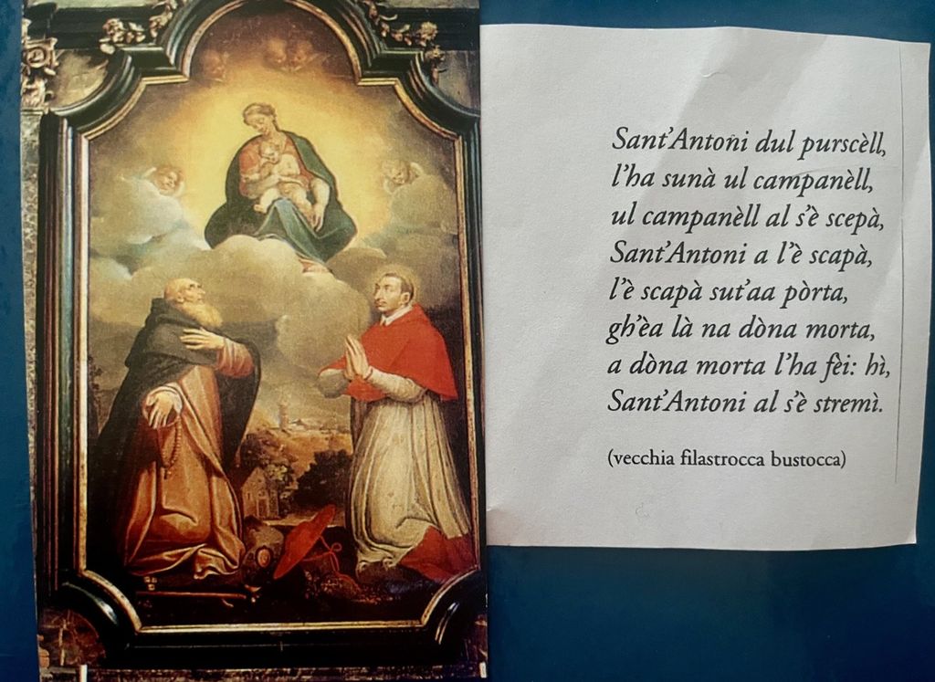 Sant'Antoni dul purscell. l'ha suná ul campanell. Ul campanell al s'é sciepá Sant'Antoni a l'é scapá. A l 'é scapá dadré d' una porta, gh'éa lá 'na dona morta. A dona morta l' ha fèi "hí", Sant'Antoni al s'é stremí.