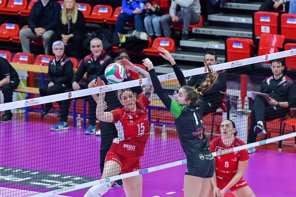 La tanto attesa sfida tra due dei migliori attacchi del campionato si risolve con le polveri un po’ bagnate da entrambe le parti (33% per Busto Arsizio, 31% per Offanengo) ma le cocche lavorano in maniera ottimale a muro riuscendo così a prendersi il derby lombardo. Grande protagonista, come detto, è Sofia Rebora: il capitano biancorosso confeziona una prestazione da standing ovation (20 punti col 66%, 5 muri e 5 ace) che le vale il titolo di MVP della gara, premiata con un pizzico di commozione da Roberta Genoni, figlia dell’indimenticato dirigente “Pat” Genoni, scomparso solo qualche mese fa. In doppia cifra anche Zanette (13) ed Enneking (12); prezioso l’impatto di Zakościelna, solida in ricezione Cecchetto (64% di efficacia) e pulita la regia di Monza.