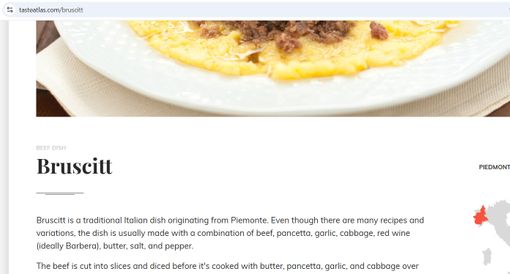 Ma come, e non ci sono i bruscitti? Eccome se ci sono, ma TasteAtlas li attribuisce al Piemonte.: «I bruscitt sono un piatto tradizionale italiano originario del Piemonte – afferma il sito “specializzato” nella pagina dedicata al nostro piatto - Anche se esistono molte ricette e varianti, il piatto è solitamente preparato con una combinazione di manzo, pancetta, aglio, cavolo, vino rosso (idealmente Barbera), burro, sale e pepe».